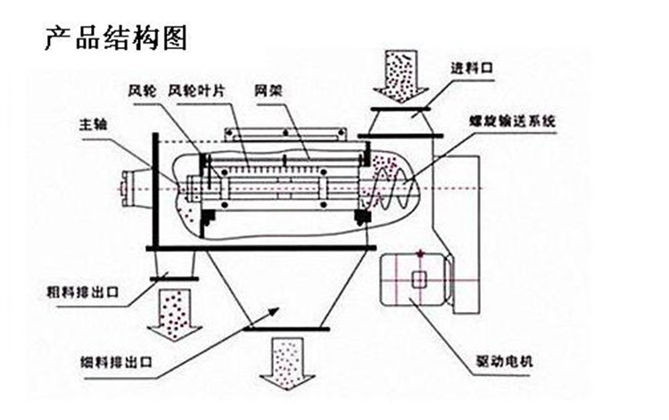 本設(shè)備篩網(wǎng)為圓筒狀,置于機(jī)體內(nèi),物料通過(guò)螺旋輸送系統(tǒng)后,和氣流混合、霧化進(jìn)入網(wǎng)筒內(nèi);通過(guò)網(wǎng)筒內(nèi)風(fēng)輪葉片使物料同時(shí)受離心力和旋風(fēng)推進(jìn)力,從而迫使物料噴射過(guò)網(wǎng),由細(xì)料排出口排出,不能過(guò)網(wǎng)的物料沿筒壁從粗料排出口排出。
