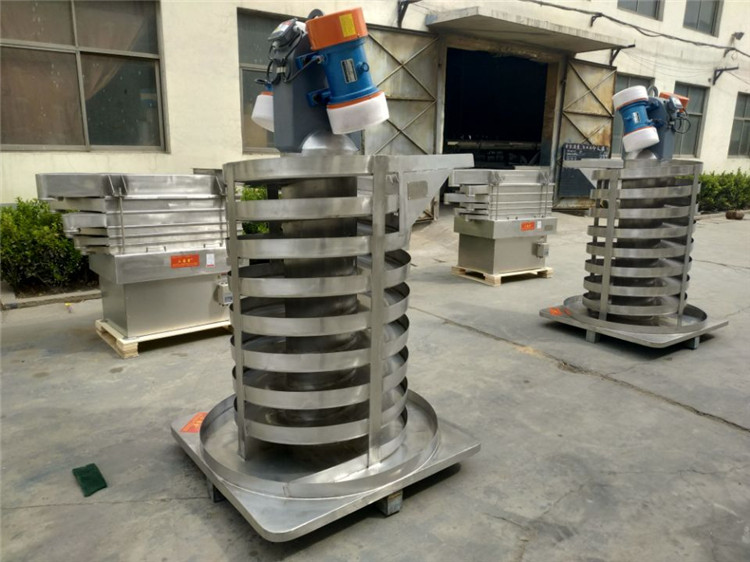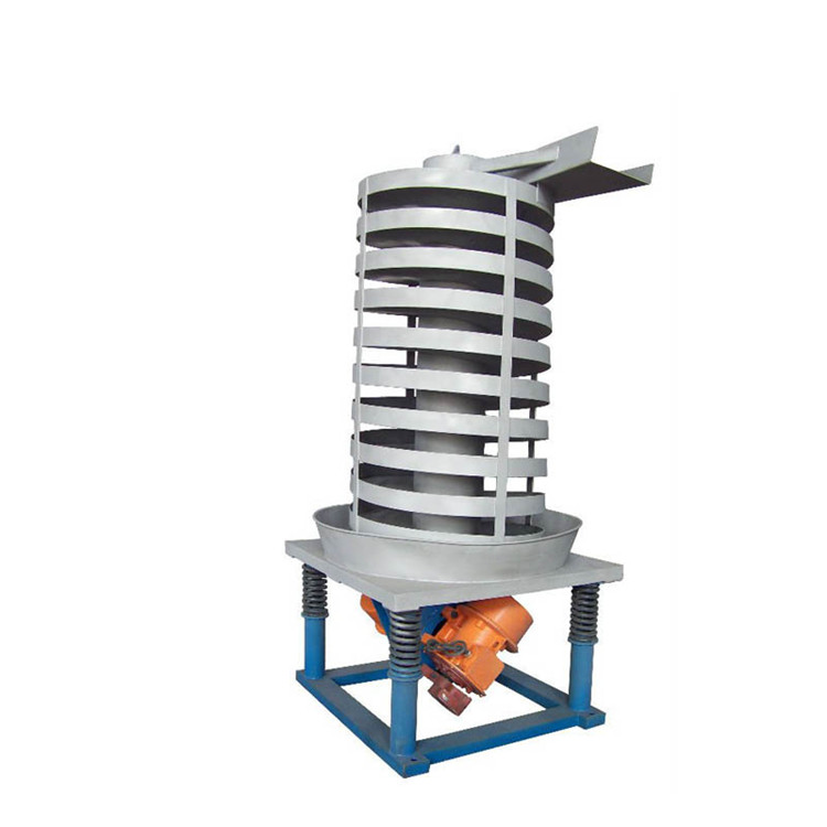 垂直振動輸送機的驅動裝置振動電機安裝在輸送塔下部,兩臺振動電機對稱交叉安裝,輸送塔由管體和焊接在管體周圍的螺旋輸送槽組成,輸送塔座于減振裝置上,減振裝置由底座和隔振彈簧組成。當垂直輸送機工作時,根據(jù)雙振動電機自同步原理,由振動電機產生激振力,強迫整個輸送塔體作水平圓運動和向上垂直運動的空間復合振動,螺旋槽內的物料則受輸送槽的作用,作勻速拋擲圓運動,沿輸送槽體向上運動,從而完成物料的向上(或向下)輸送作業(yè)。
