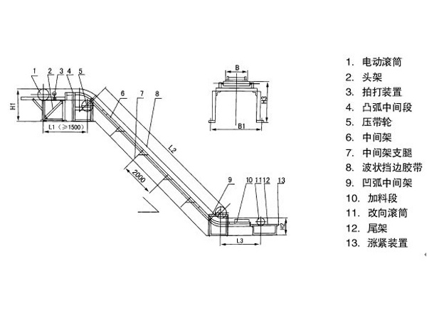 大傾角帶式輸送機(jī)輸送傾角,采用滾筒電機(jī)集中驅(qū)動,由:電動滾筒、頭架、拍打裝置、凸弧中間段、壓帶輪、中間架、中間架支腿、波狀擋邊膠帶、凹弧中間架、加料段、改向滾筒、尾架、漲緊裝置。其結(jié)構(gòu)見圖下圖